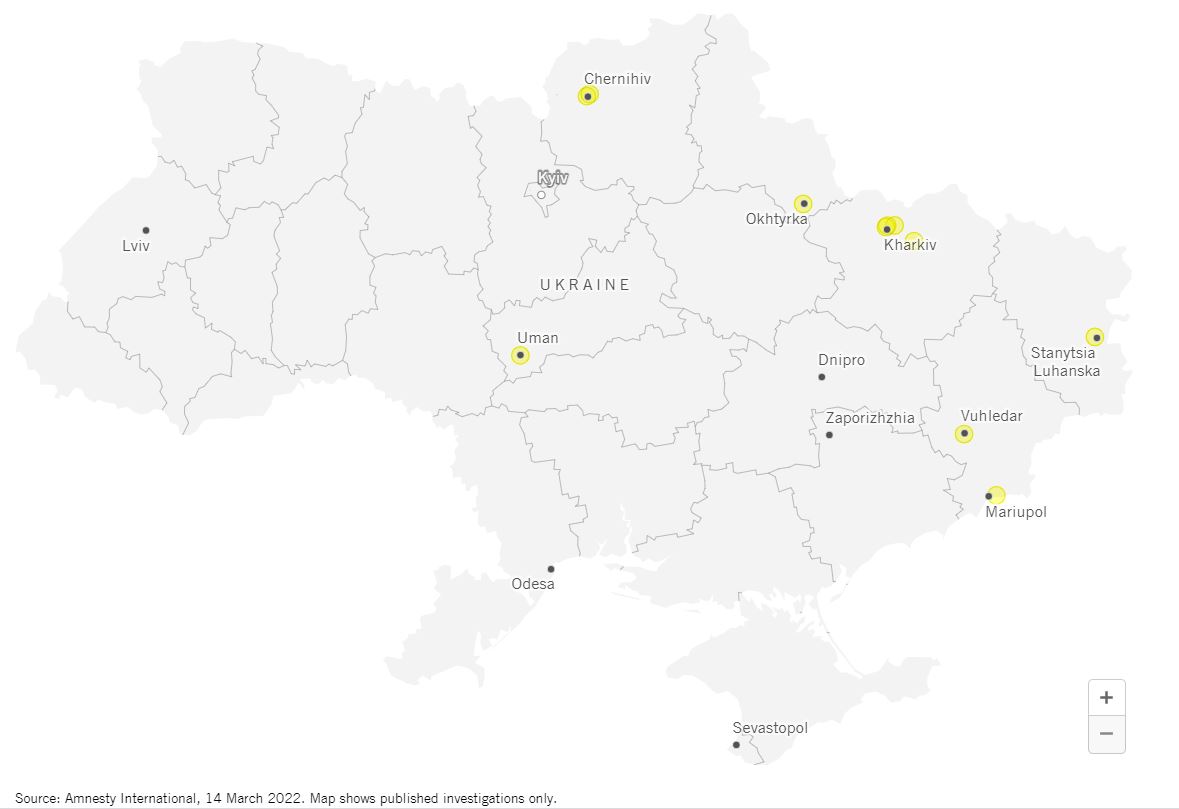 Carte des crimes de guerre potentiels sur lesquels nous avons enquêté au 14 mars 2022.