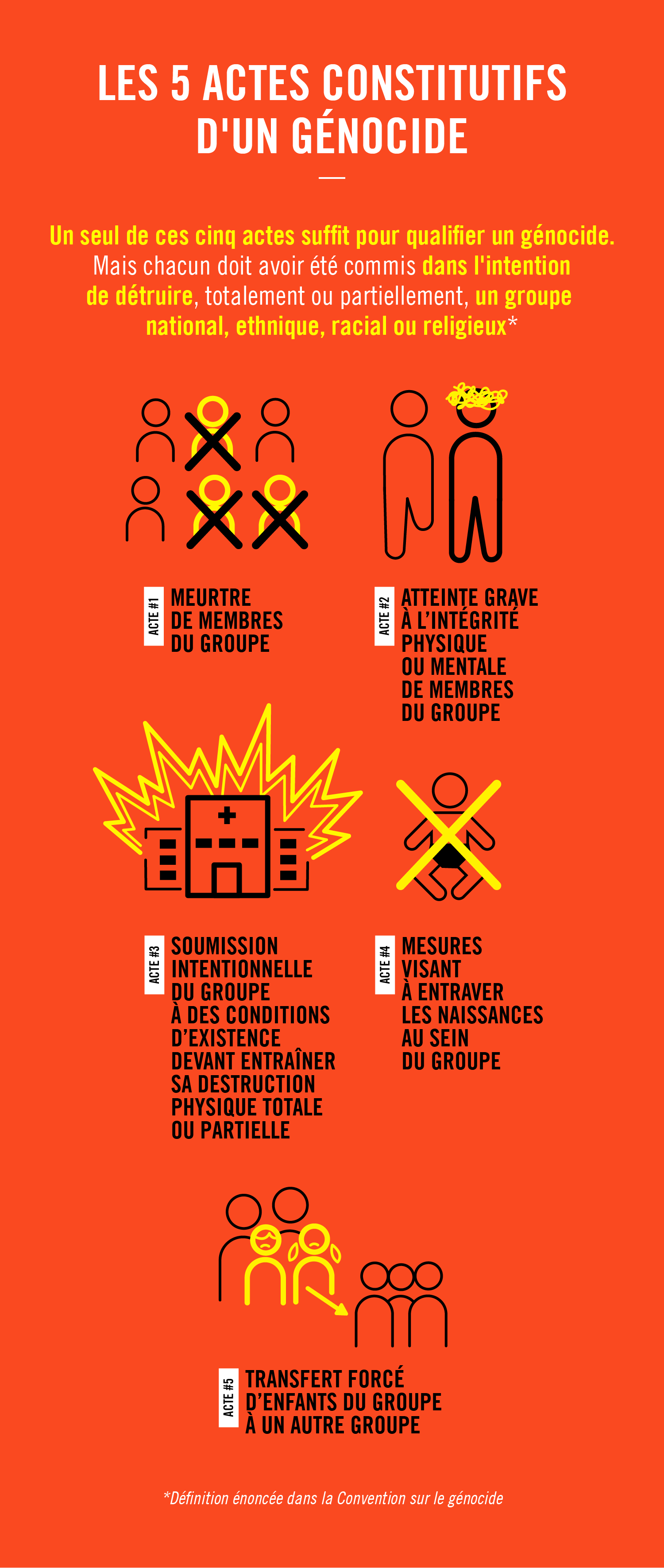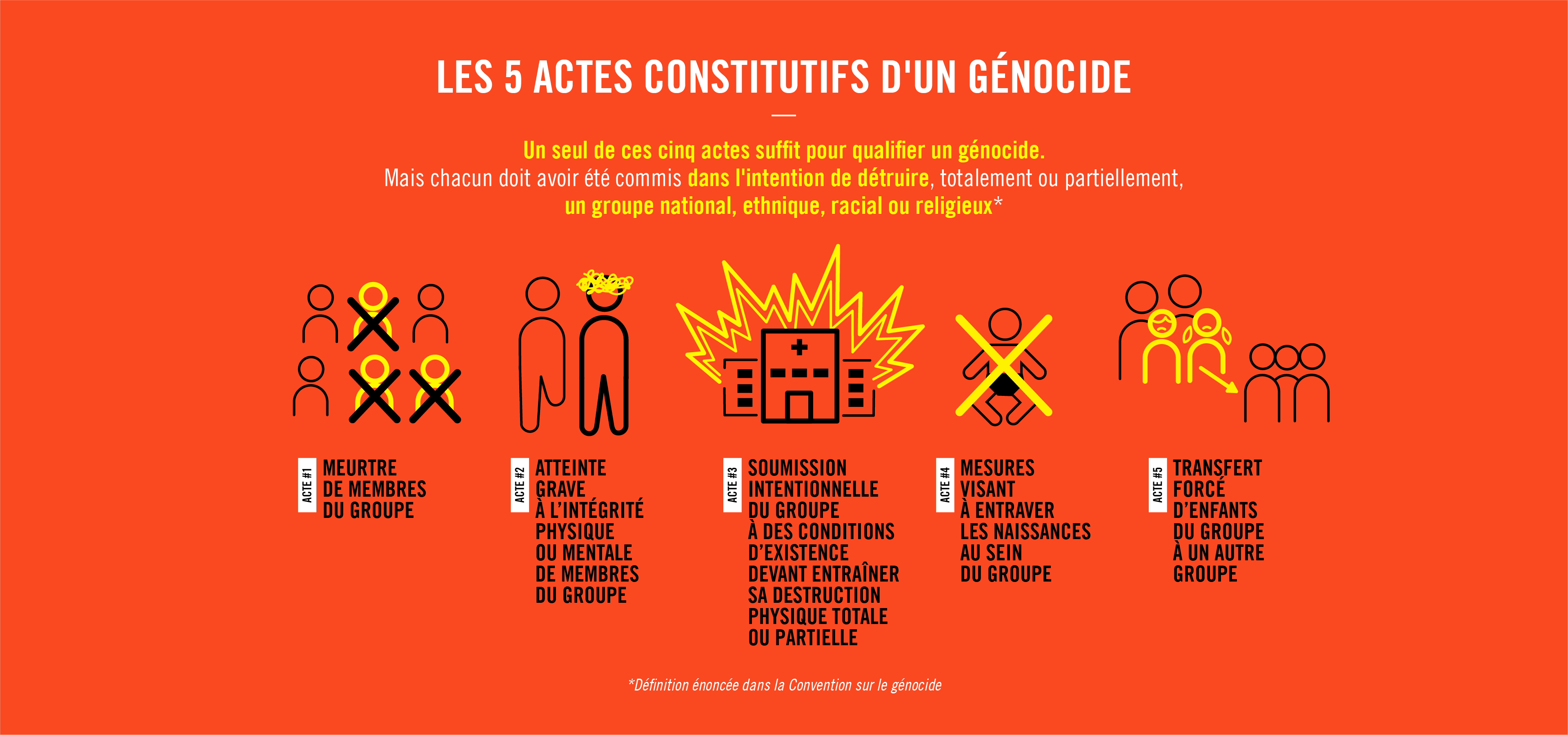 Un seul de ces cinq actes peut suffire pour qualifier un génocide. Mais chacun des actes doit avoir été commis avec l’intention de détruire. Et les actes doivent viser les individus non pas en tant qu’individus mais en tant que membres du groupe protégé par la Convention.