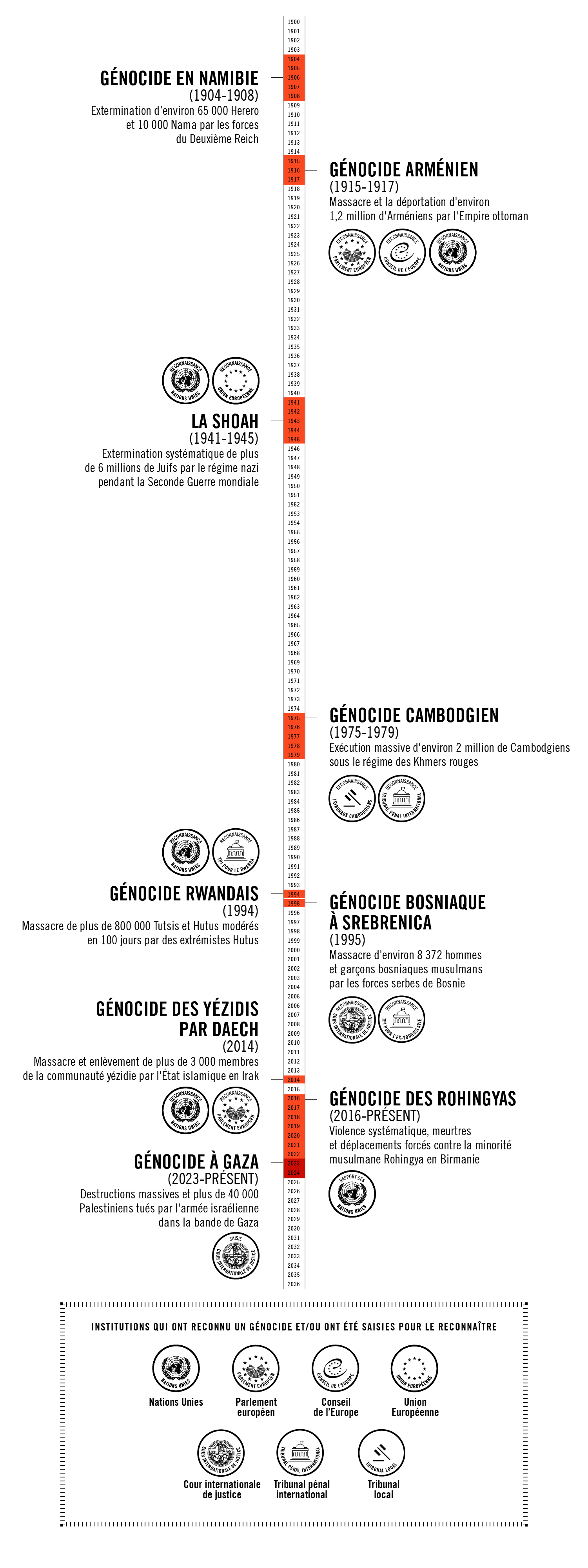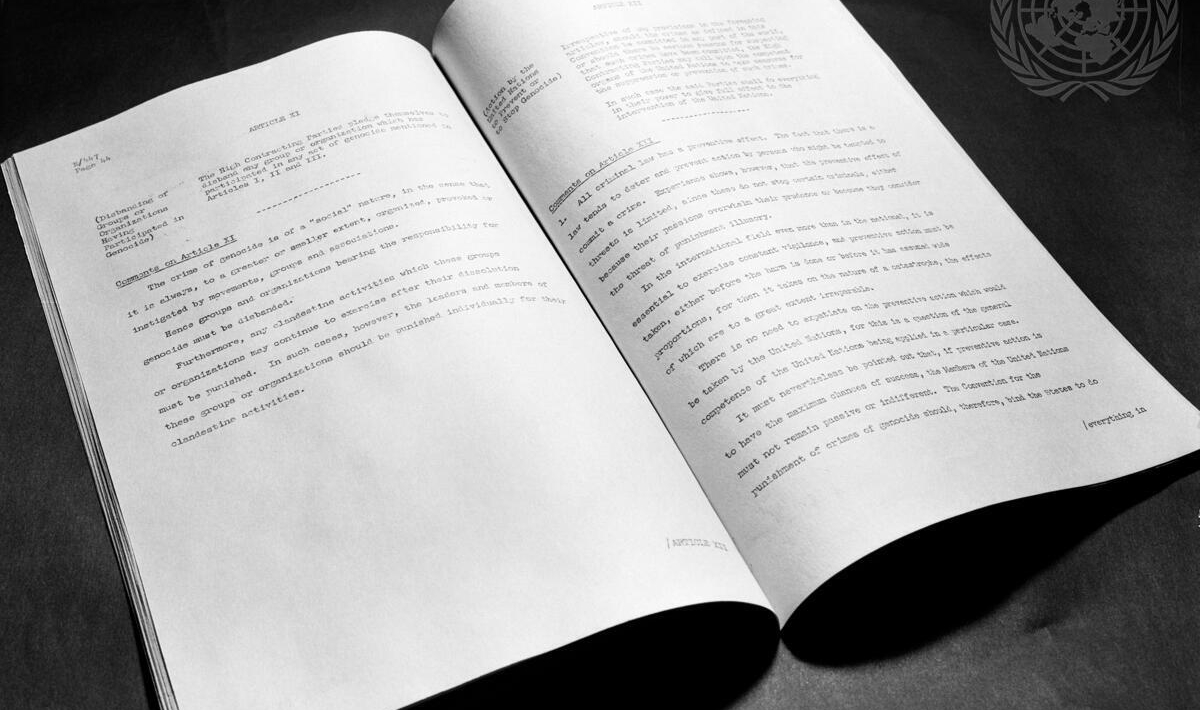 Au lendemain de la Seconde Guerre mondiale et du génocide des juifs d’Europe, l’Assemblée générale des Nations unies fait du génocide un crime en droit international. Le texte qui l’encadre est la Convention pour la prévention et la répression du crime de génocide, adoptée à l’unanimité en 1948. Composée de 19 articles, c’est cette Convention qui propose la première définition juridique internationale du génocide.