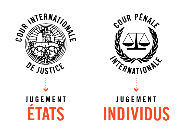 • Quant à la Cour pénale internationale, elle juge les individus responsables des crimes. La Cour pénale internationale n’intervient que si l’État sur le territoire duquel les crimes ont été commis n’a pas la volonté ou la capacité de mener des enquêtes et des poursuites. Cette Cour est compétente pour juger quatre types de crimes qui sont les crimes de génocide, les crimes de guerre, les crimes contre l’humanité et les crimes d’agression commis depuis le 1er juillet 2002.