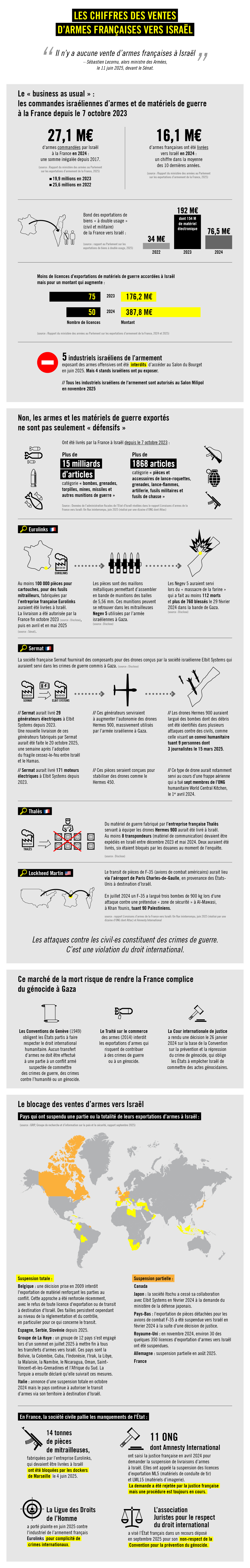 La France, par ses ventes d’armes, risque de devenir complice des crimes commis, dont le crime de génocide. Nous martelons l’urgence d’un embargo complet sur les armes. Pourtant, la France n’a toujours pas arrêté ses ventes d’armes vers Israël. Au contraire, les chiffres et données disponibles prouvent que malgré le génocide en cours, les ventes d’armes françaises n’ont jamais cessé.